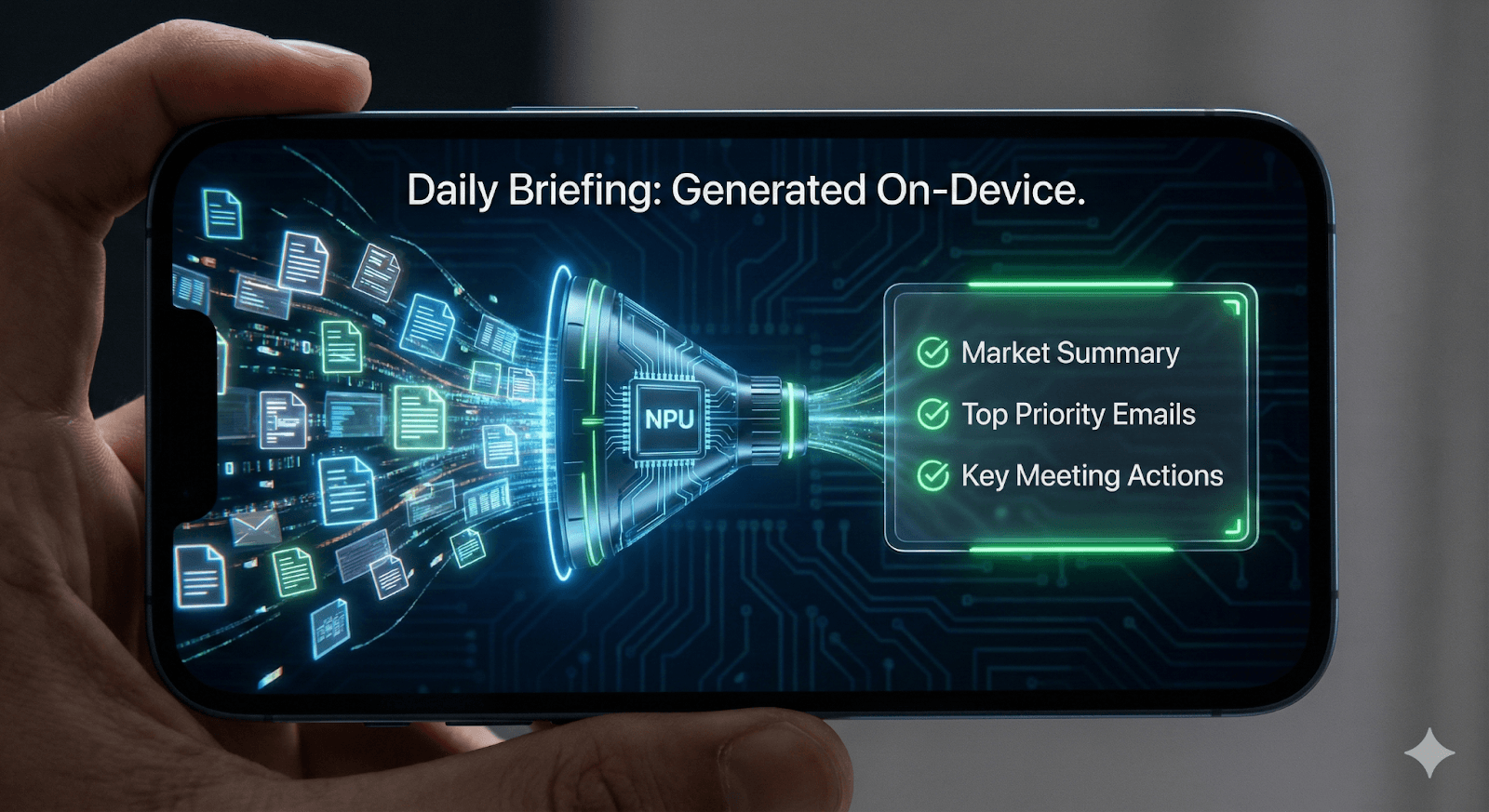 Healthcare: An app which allows managing patient information among a crew at the hospital. A doctor starting a shift receives a summary of the last 12 hours of patient notes ("Vitals stable, Medication adjusted"). This occurs entirely on-device, protecting patient privacy.